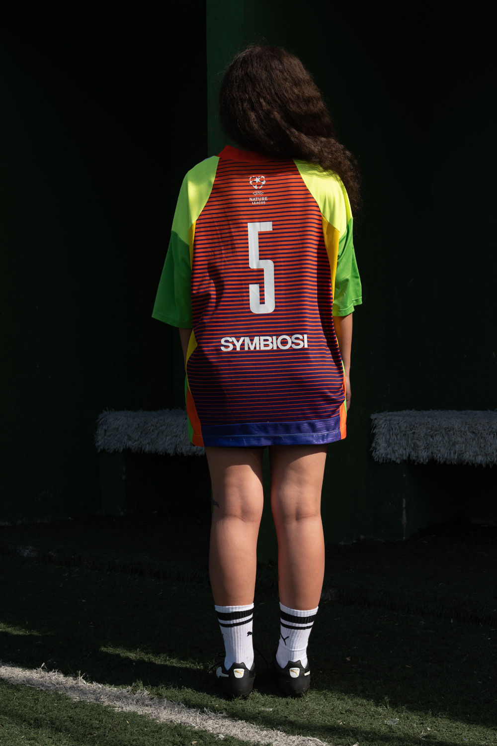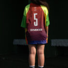 Peça única, construída com camisas vintage de times de futebol de padronagens diferentes. Cores predominantes: vermelho, amarelo, verde. Possui diversos recortes, ilustração em recorte de algodão no meio frente e detalhe de shibory 3D nas mangas. Gola em V, número 5 nas costas.